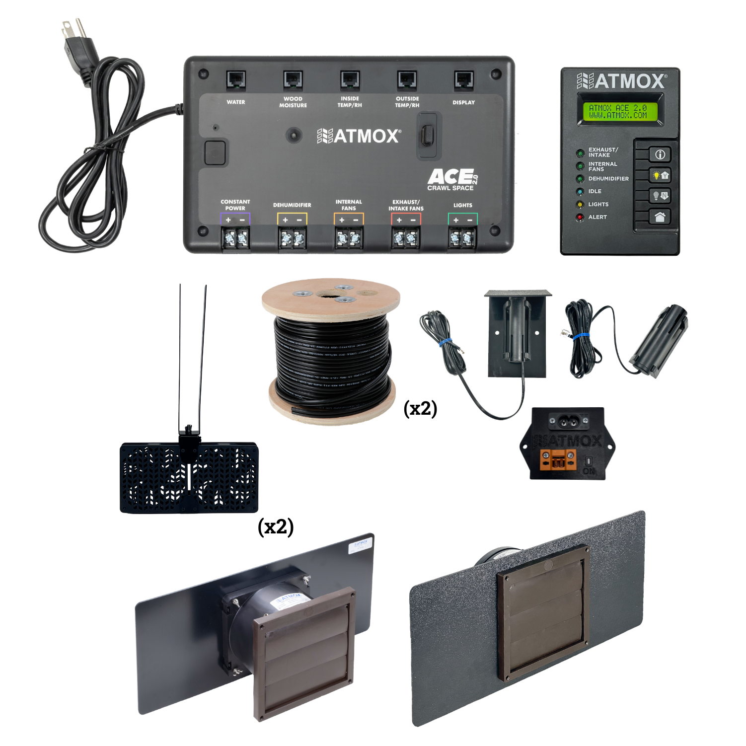 The ATMOX Crawl Space Essentials Package delivers a comprehensive, intelligent foundation for managing crawl space conditions through automated monitoring and system control. Centered around the ACE 2.0 Controller, this kit provides real-time environmental data and enables coordinated operation of ventilation, circulation, and dehumidification components to maintain balanced conditions beneath your home. Designed for crawl spaces up to approximately 1,200 square feet, this package includes key hardware needed to actively move air, improve circulation, and integrate with a compatible dehumidifier (sold separately). The system continuously gathers data from installed sensors and allows the controller to trigger fans and connected equipment based on changing conditions—helping you stay informed while reducing the need for manual adjustments. With both intake and exhaust ventilation, along with internal circulation fans, this kit promotes consistent airflow throughout the crawl space. The included 24VAC dehumidifier relay kit allows seamless integration with leading dehumidifier brands, enabling centralized control through the ATMOX system. Dehumidifiers must have terminal blocks that allow for external control. This package is ideal as a base system and can be expanded with additional components for larger or compartmentalized crawl spaces. Built for reliability and flexibility, ATMOX products are backed by a 3-year limited warranty. Bundle – 07-KIT-C01